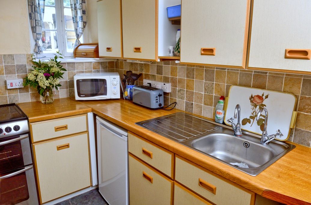 - Kitchen with electric cooker, fridge/freezer, microwave.